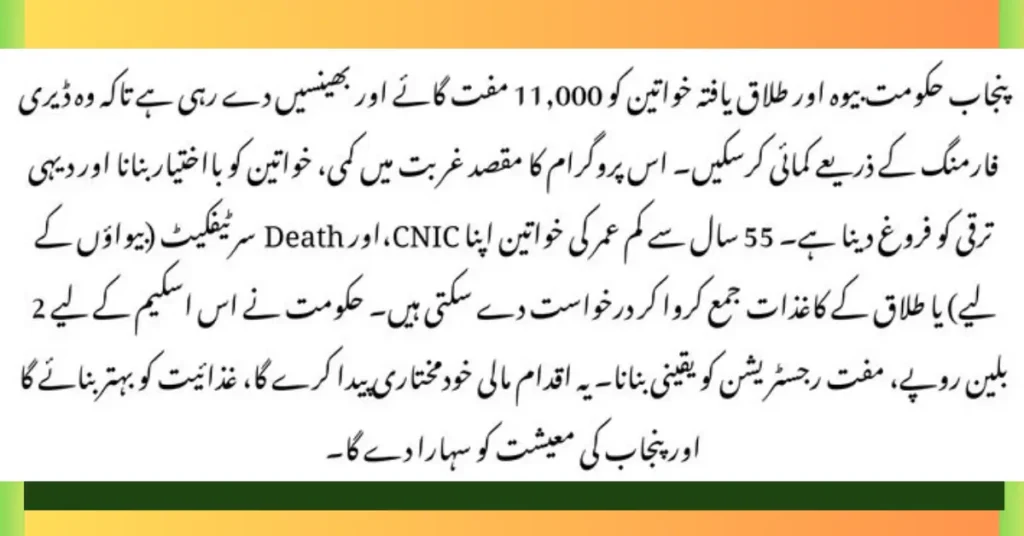 This CM Punjab Free Livestock initiative is for widowed and divorced women experiencing financial hardship, with free cows and buffaloes for dairy farming. The government aims to lessen the poverty of the vulnerable women, enable their economic independence, and provide greater stability in the livestock sector in Punjab and rural areas through livestock ownership, with a budget of 2 billion rupees, so that all those eligible have livestock for better economic livelihoods.